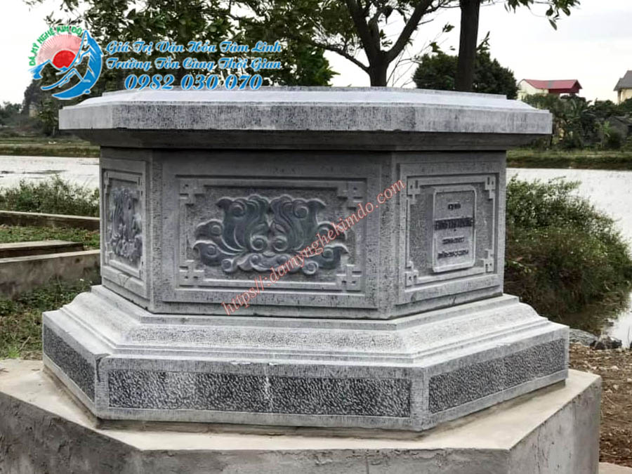 - Phần bia mộ được chạm khắc ngay trên bưng thân mộ lục giác. Hoa văn sử dụng đơn giản không quá cầu kỳ. Tất cả tạo nên mẫu Mộ lục giác đá đẹp