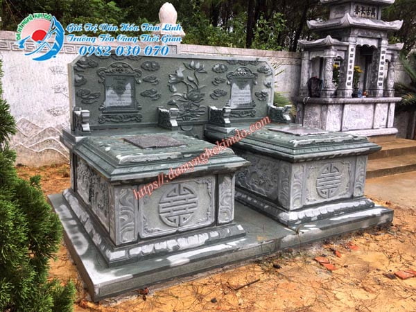 Mộ bành đá đôi là mẫu mộ được ghép bởi hai mộ bành đá đơn với nhau. Hai mộ đặt gần nhau và chung bằng bia mộ đá. Mộ đá đôi có kích thước chuẩn phong thủy: 167x127cm. Chất liệu sử dụng là đá xanh rêu. Hoa văn chạm khắc là hoa văn chữ thọ tròn, lá lan, sen, hoa văn tứ quý, vân mây…